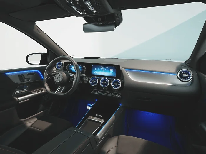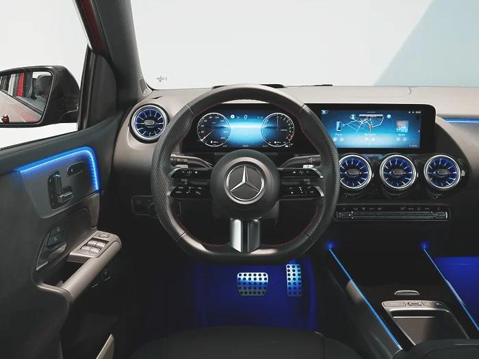 Interior between high-tech and sportiness:The interior of the new B-Class is neatly practical and spacious. The driver-side cut-out is dominated by the dual-screen display (7-inch instrument cluster and 10.25-inch head unit), which is included as standard. In the optional variant with two 10.25-inch displays, a wide-screen look is created through which the element appears to float.